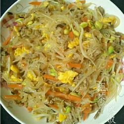 5.Pour in the bean sprouts and the eggs fried earlier, sprinkle some recipe, and add some soy sauce.