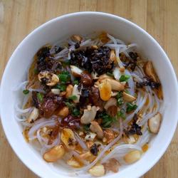 7.Put the soaked vermicelli in a bowl, heat water, add chopped green onions, coriander, peanuts, chili oil, and pour some balsamic vinegar (I put less, it depends on personal taste) and you are ready to eat