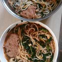 2. Boil the bone soup, add the meat patties, add the bean sprouts and mushrooms after the meat changes color, then add the leeks, cook until half cooked, add salt and soy sauce to taste, then add the rice noodles and water pickles, boil again Remove from the pot and put into a bowl