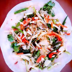 8.The rest is to put your favorite vegetables into the cake, you can include shredded potatoes and bean sprouts Vegetables, fish-flavored shredded pork, etc.I used northeastern green onions, soybean paste and potato shreds