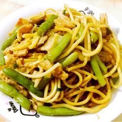 1. First, cut the pork belly into thin slices and set aside.Fold the beans into 5 centimeter pieces and set aside.Cut the noodles into 10 centimeter lengths without soaking them in water.