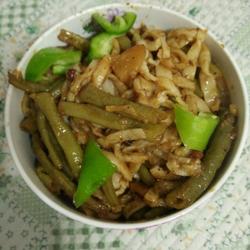 6.Add in the beans and fry until the beans are slightly bright and green, then add Salty salt