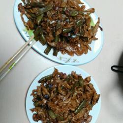 6.The noodles are neatly fried in green beans.On top of the meat, cover the pot and simmer over medium heat for 15 to 20 minutes