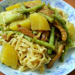 2.Meat Add shredded onion, ginger and star anise to the pan and saute until fragrant, add soy sauce to color, then add potatoes and beans, stir-fry for two minutes, add salt, thirteen spices, and light soy sauce.Add boiling water to cover the ingredients.Cover the pot and simmer over medium heat for 5-10 minutes.