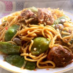 4.Put the noodles on the lentils, and cover the beans with the soup.Pour a little less salad oil, cover the pot and simmer over low heat.