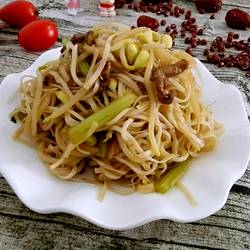 6. Add the soybean sprouts and celery and stir-fry evenly, add an appropriate amount of salt and chicken essence to taste, add an appropriate amount of water and bring to a boil
