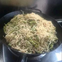 4. Stir-fry, add the chopped beans and green peppers, add an appropriate amount of salt, stir-fry, add a little vinegar and water to just cover the vegetable noodles