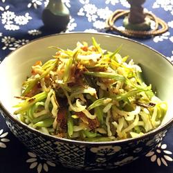 Add oil to the shredded meat to prevent it from sticking to the pan.The noodles are the thinnest kind and raw.