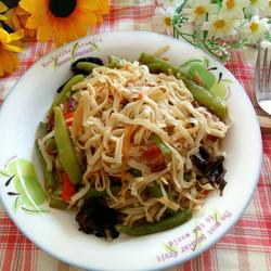 3.Wash the beans and break them into small pieces.Add the mushrooms, fungus and carrots to the pot, stir-fry evenly and add enough water?