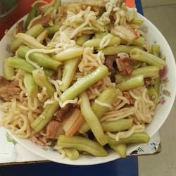 6. Stir-fry the beans and meat for a while and add water.The water just does not cover the beans, and pull it well.Sprinkle the noodles on the beans bit by bit.After boiling the pot, turn it off over low heat for ten minutes.Turn off the heat and simmer for a while, drizzle with sesame oil and remove from the pot.