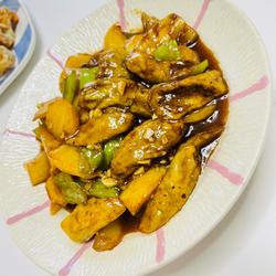 5.Put a spoonful of sugar in a small bowl, add dark soy sauce and allspice powder Add a small amount of oil, salt, water and starch to the pan.Add a small amount of oil to the sauce, add potatoes, eggplants and peppers, stir-fry and serve.
