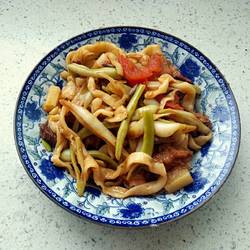 5. Add the meat slices and stir-fry, add the pepper powder, cooking wine, and dark soy sauce and continue to stir-fry saute.