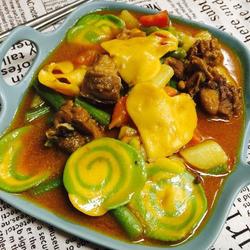 After all the spices are fragrant, add the chicken pieces and pour in the chicken Add some cooking wine and stir-fry for 1 minute and add boiled water.Bring to a boil over high heat, then reduce to low and simmer for half an hour until the meat is tender when pierced with chopsticks.Add beans, cook for 3 minutes and add carrots and potatoes.When it is 80% cooked, add the colorful dough we made.