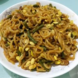 8.Close Turn on the heat, use a spatula to cut the noodles into four equal portions, then use chopsticks to shake out each portion of noodles, then mix the vegetables and noodles evenly and serve.