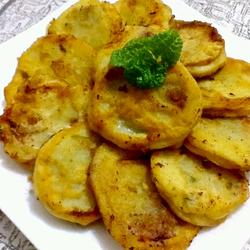7. Heat the pan and pour oil, put the stuffed radish box into the batter and wrap it Add the batter and fry slowly over low heat