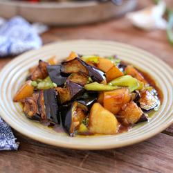13.Finally, pour the fried eggplant and potatoes into the pot, stir-fry quickly over high heat to reduce the juice