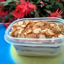 4.Put another cake slice on top and spread with caramel sauce.Pour on the cream one after another, and sprinkle with crispy and almond slices