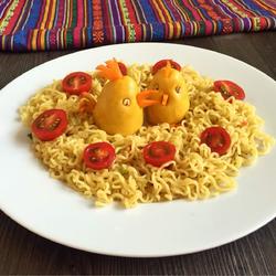 6. Make baby chicken, use carrots to make baby chicken feet.Heat water in a pot and steam for fifteen to twenty minutes..