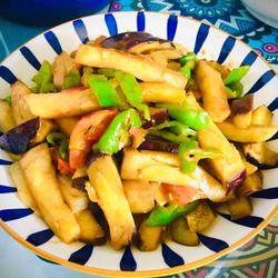 3. Stir-fry the eggplant until it changes color, and add the green pepper.