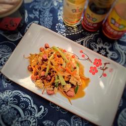 5.Heat oil in a pan, add peanuts and fry until cooked, remove and add day lily together