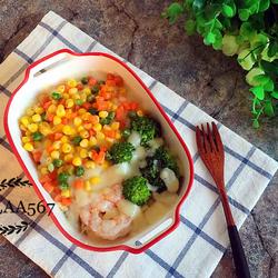 8. Preheat the oven to 200 degrees for 5 minutes.Put the fried rice into a bowl, place shrimps, broccoli and corn kernels, peas, diced carrots, and grated cheese.