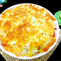 6.Place the shrimps and crispy sausages on top and bake at 180 degrees for 18 minutes