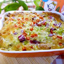 8.Place it in a baking bowl, sprinkle with grated cheese on top, and then sprinkle with the remaining Diced carrots and diced onions and celery.Bake in the oven at 180 degrees for 20 minutes.