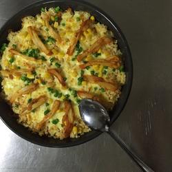3. Add the fried chicken leg steaks and onions.into the rice, stir evenly