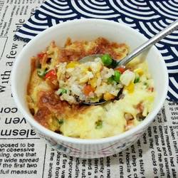 11.Put the fried rice into a bowl, not too full, and sprinkle a layer of shredded cheese