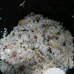 The delicious and fragrant yellow crab sausage rice is ready, I also added a Put some bacon in it, it tastes good