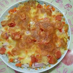 Rice, carrots, onions, ham, sausage and cheese (appropriate amount) | Salt and oil chicken powder ( ) |