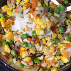 1. Put the onions into the hot oil pan and stir-fry until fragrant.Add the ham, green beans and corn kernels.Add black pepper and stir-fry on the 7th gear of the rice cooker.Season with salt