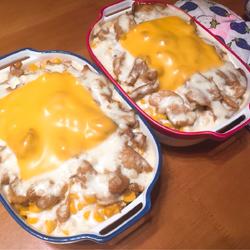 6. Prepare three baking bowls, fill them with rice, cover them with corn, and add chicken , pour the white sauce, don't pour too much or it will get greasy, and then put the cheese slices (if you like drawing, you can put shredded mozzarella cheese)