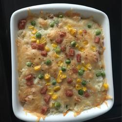 3. Place the fried rice in a baking bowl and sprinkle mozzarella cheese on top , then sprinkle with the remaining corn and ham cubes, and sprinkle with a little pizza grass.