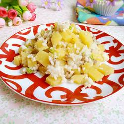 5. There is still some soup in the pot after the potatoes are soft and rotten.When it disappears, pour the rice in and mix well for a minute.Add salt and MSG and mix well.