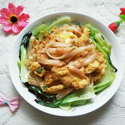 6. Stir-fry the vegetables until soft and add them in Rice noodles, eggs, then add salt, five-spice powder, light soy sauce, stir well