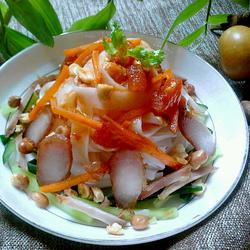 1. Shred cucumbers and carrots, peel and cut tomatoes Prepare diced pork, barbecued pork and peanuts for later use