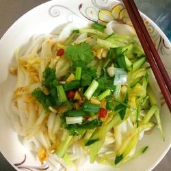 3. Pour cucumber and Chinese cabbage in boiling water, scoop them out and put them on the rice noodles On top, pour the prepared sauce
