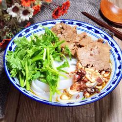 9. Remove the beef slices from the beef soup, Put it on the rice noodles
