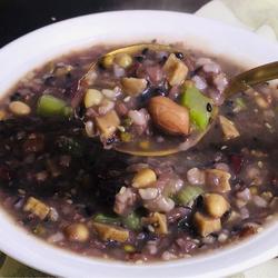 11.After half an hour, cook the peanuts, beans and rice into a thick porridge, add the fried bacon and sesame seeds, mix well and continue to cook for ten minutes