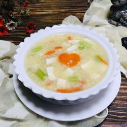 6.After 15 minutes, Xiaomi boiled until When the soup is thick, add tofu, mix well and bring to a boil