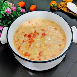 15. When the porridge cooking time is up, add chopped tomatoes and loofah