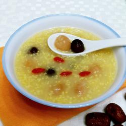 4. After the water boils, put the red dates, longan and washed millet into the pot.After boiling, turn down the heat and simmer for about 50 minutes.Add the rock sugar.Cook for a few more minutes, turn off the heat and add the wolfberry.Completed
