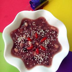 4. Pour the cooked porridge into a bowl and add some wolfberry and white sesame seeds.