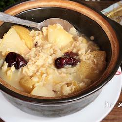 Oatmeal is easy to overcook, so you can add it last.If it is oatmeal, add it together with the pear and cook for an hour.
