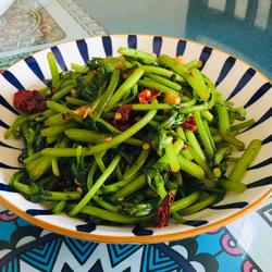 4. Add the chrysanthemum stems and stir-fry for a while.
