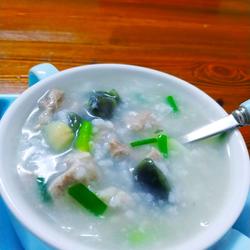 7.After cooking the rice for one hour, add the processed preserved eggs and lean meat, and cook the green onion for another ten minutes