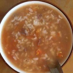 5.Pour the tomatoes into the white porridge and turn to medium heat.Cook, add a drop of oyster sauce, and cook until the soup is slightly thick