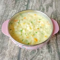 The size of the pimple can be adjusted according to the baby's chewing situation.Babies over one year old can keep a little corn coating to help gastrointestinal motility.When pouring the rice noodles into the pot, be sure to stir while pouring to avoid burning the pot.