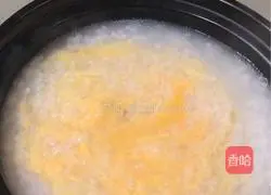 6.Pour the eggs into the porridge and break them up using chopsticks in circular motions.Cook for a minute or two and the eggs are ready to eat